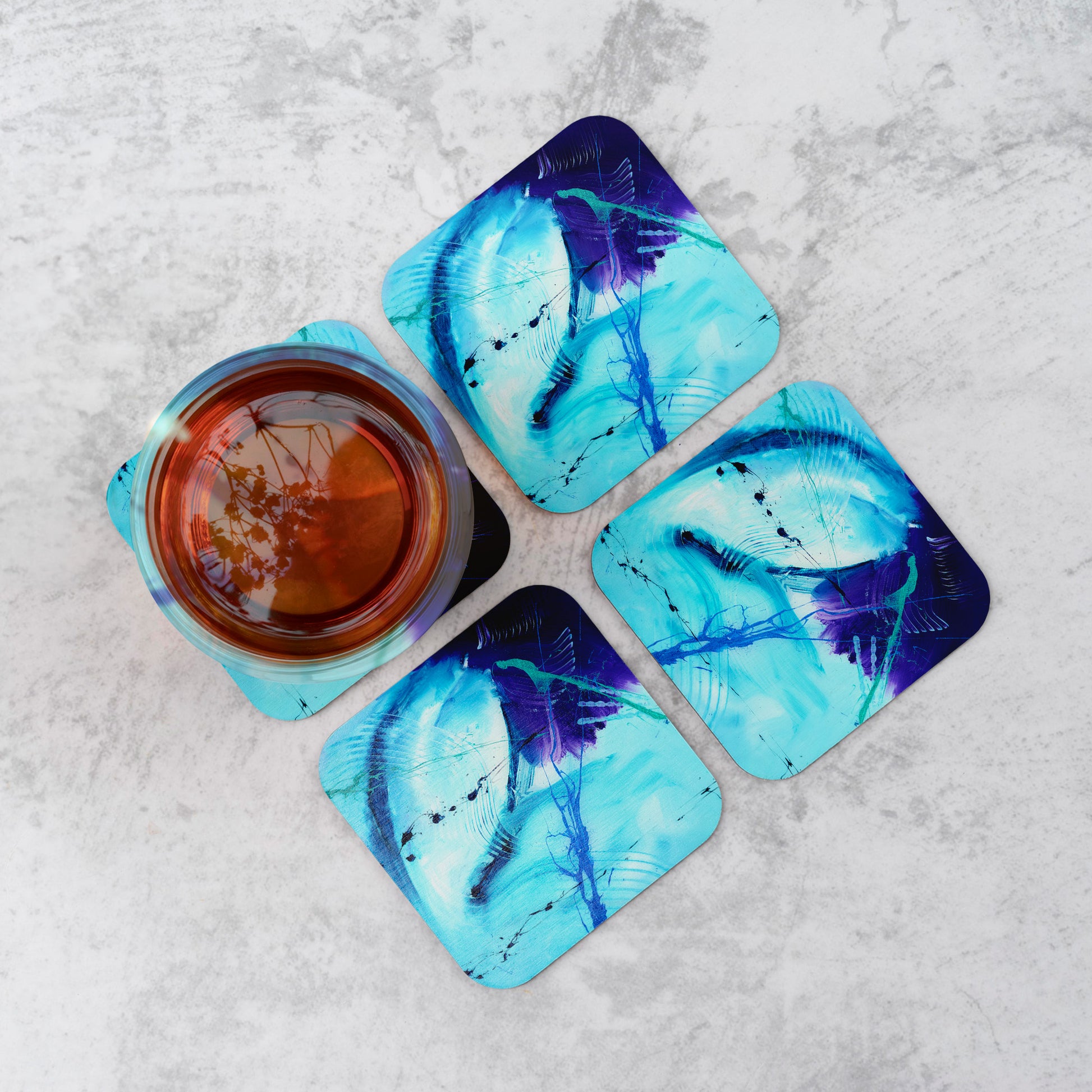 Give your favourite surfaces a lift with stunning abstract coasters. The perfect way to jazz up coffee tables, dining tables or even mantle pieces. These showstopping coasters have a hard wooden base that will prevent your surfaces from getting scratched, while the glossy artwork on the face shines in all its glory. Set of 4.